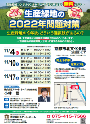 農地相続コンサルタントがわかりやすく解説する生産緑地の2022年問題対策についての無料セミナーを開催します。