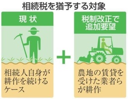 後継者不足などで営農継続が厳しくなった所有者を考慮し、29年度税制改正では、農業への従事を希望する人に生産緑地を貸す場合の相続税の納税猶予の適用なども検討する。